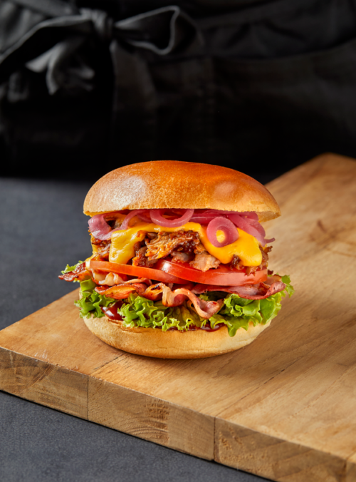 - À l'aide d'une pince, retirer l'ensemble steak-fromage et le déposer sur le talon du burger.